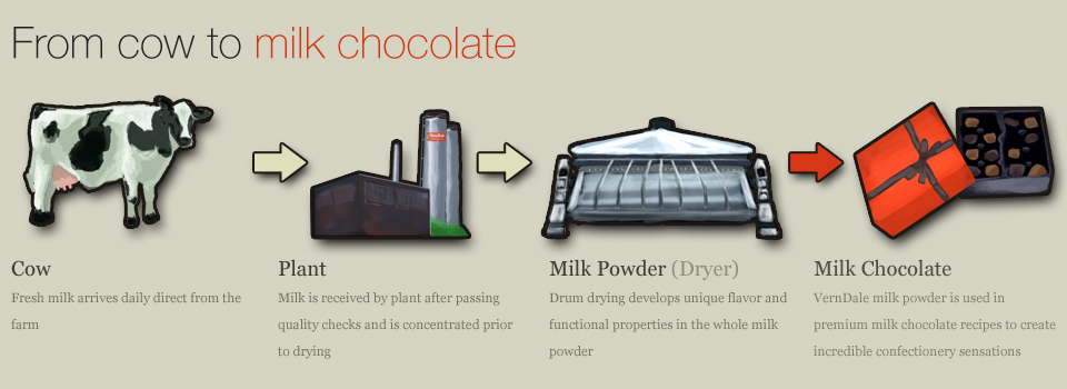 The best tasting milk chocolate is made from the highest quality ingredients. For over 50 years, premium chocolate manufacturers have chosen VernDale as their supplier of roller dried whole milk powder. Centrally located in Detroit, Michigan, VernDale Products' artisan approach to dairy processing combines trusted craftsmanship with modern equipment and technology, resulting in a milk powder used only in the most desirable chocolate formulas.